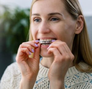 woman inserting transparent invisible dental aligners for crooked teeth straightening